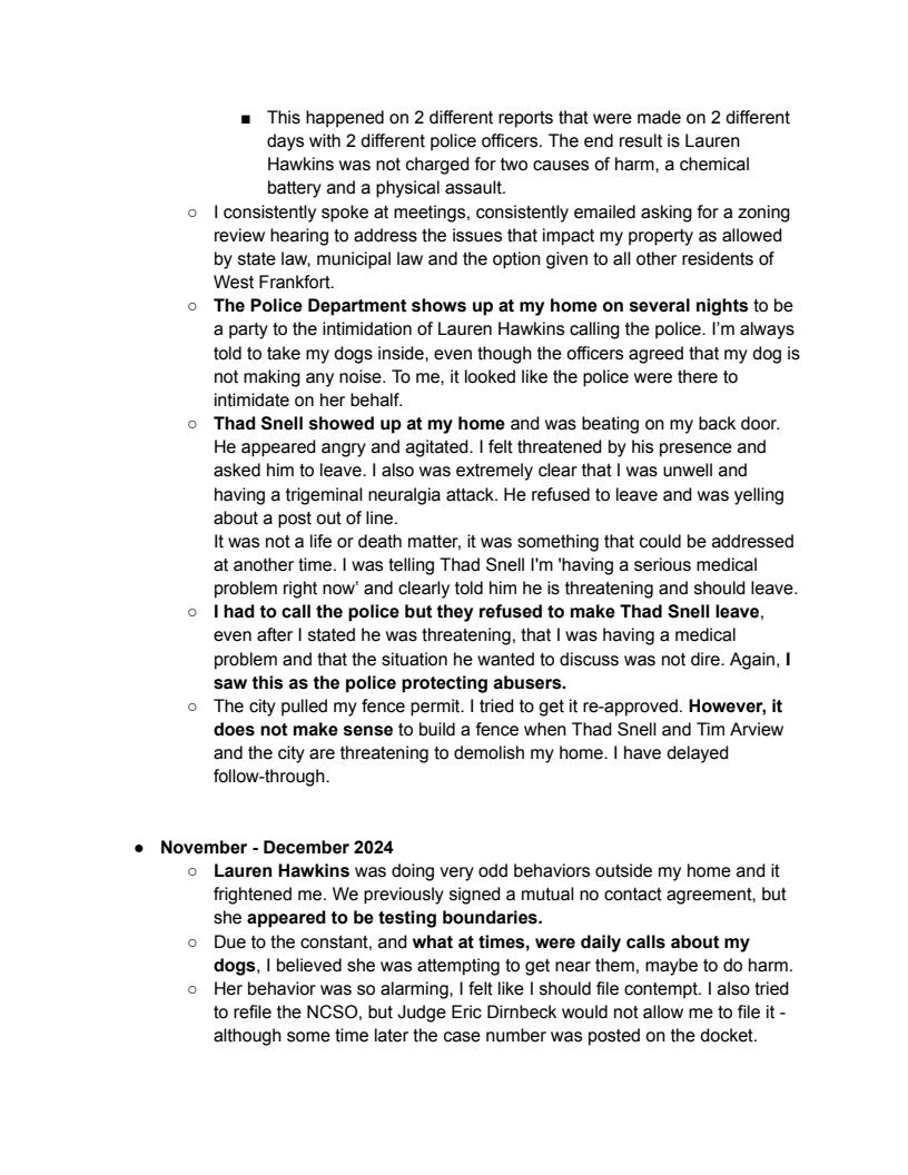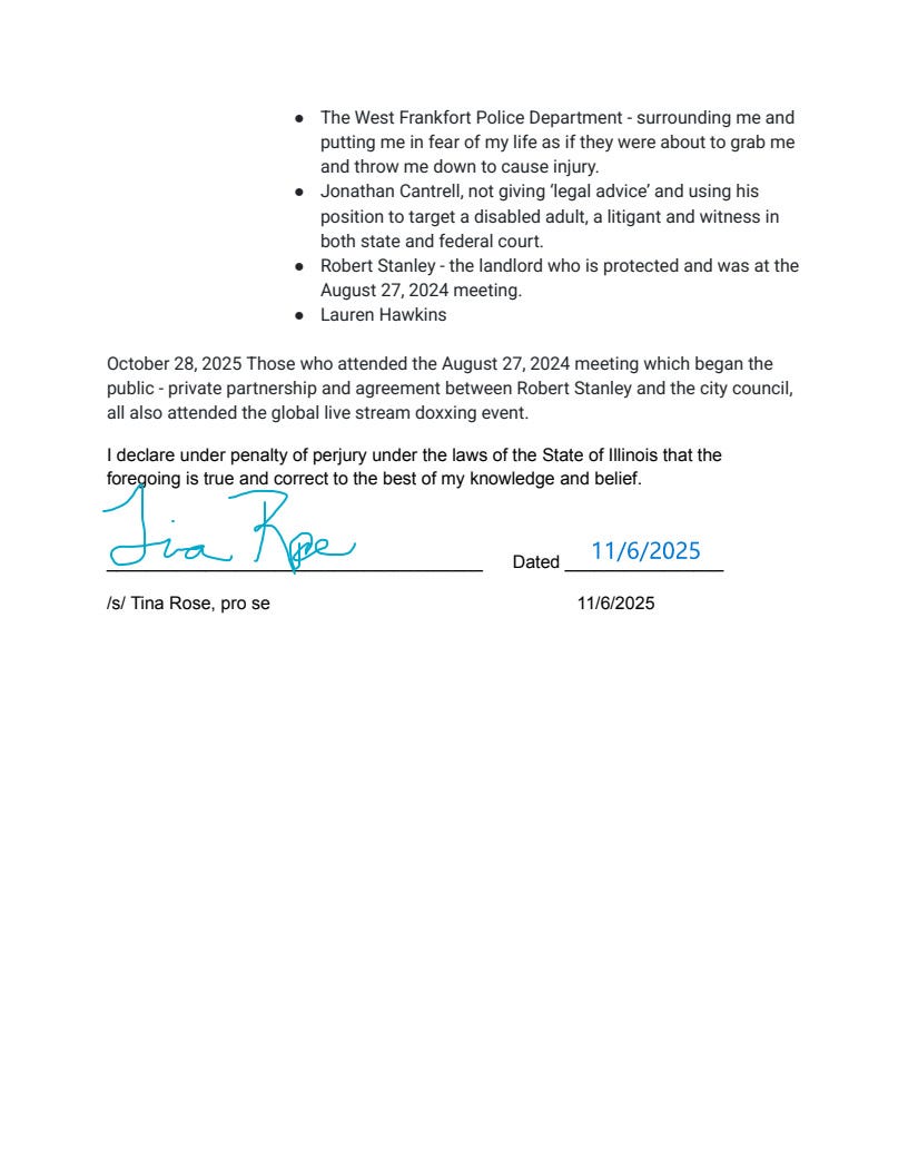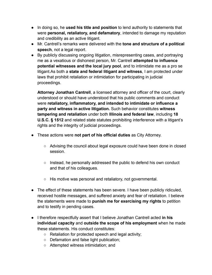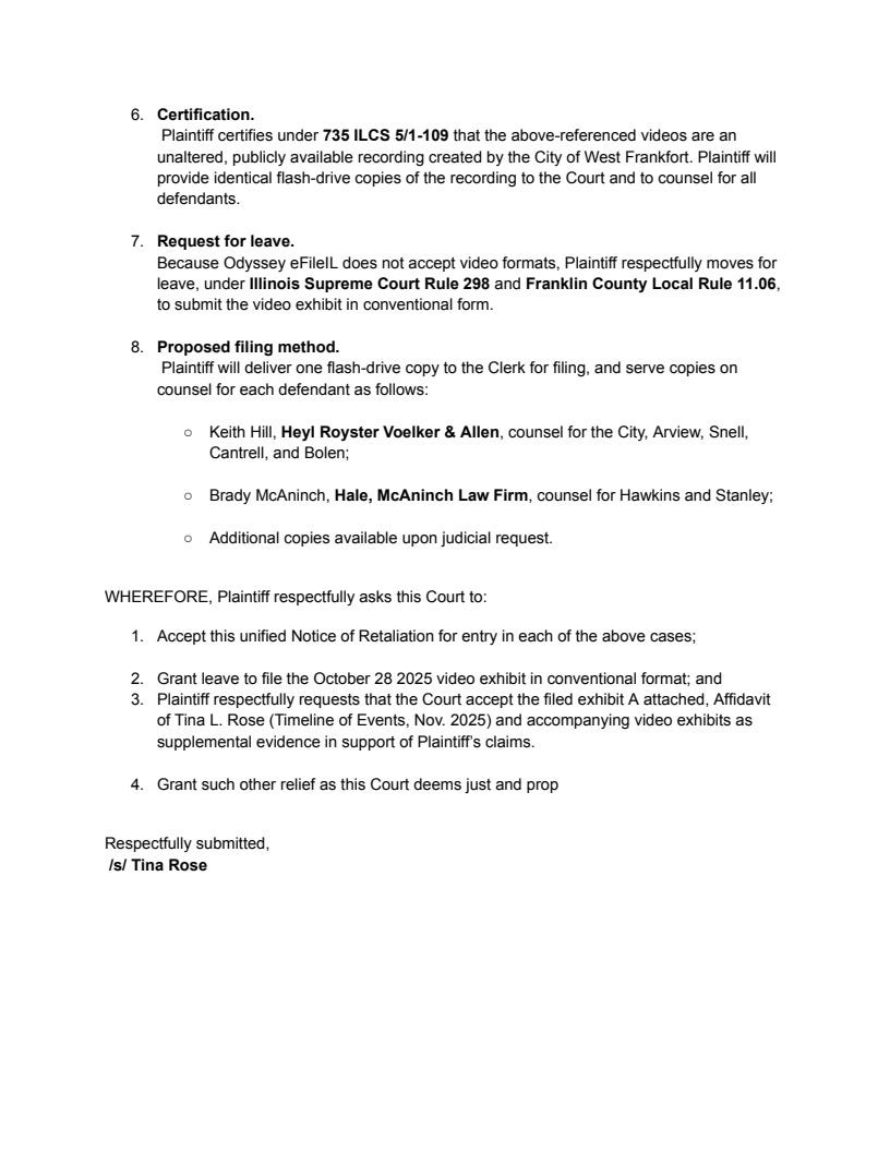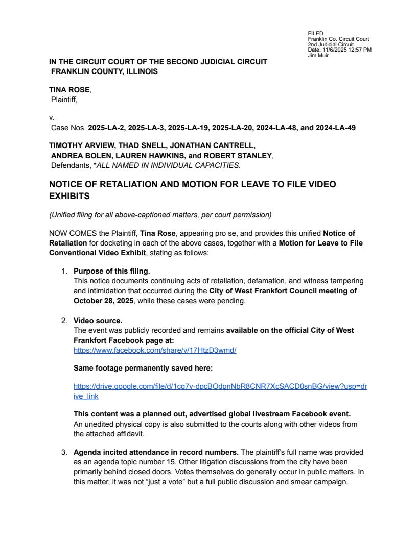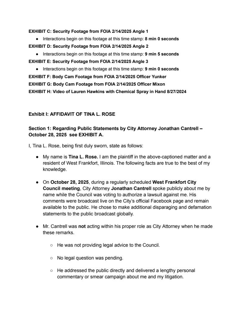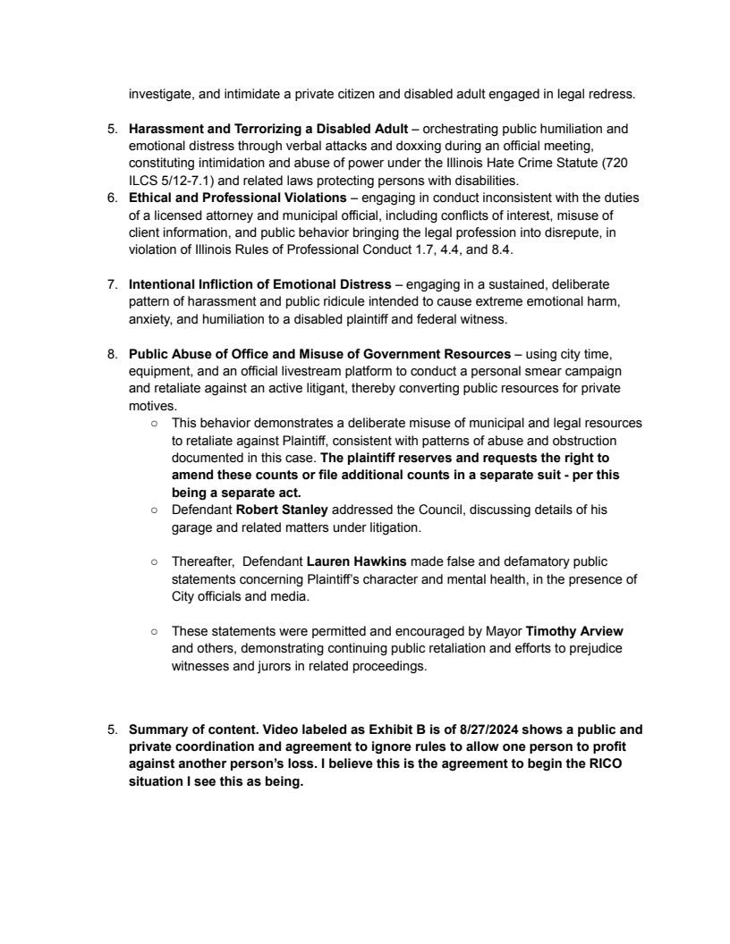 The filing is twenty pages long, complete with sworn affidavits and video exhibits. It documents the continuity and collaboration among a small circle of city officials and private citizens whose coordinated actions have targeted me for over a year.