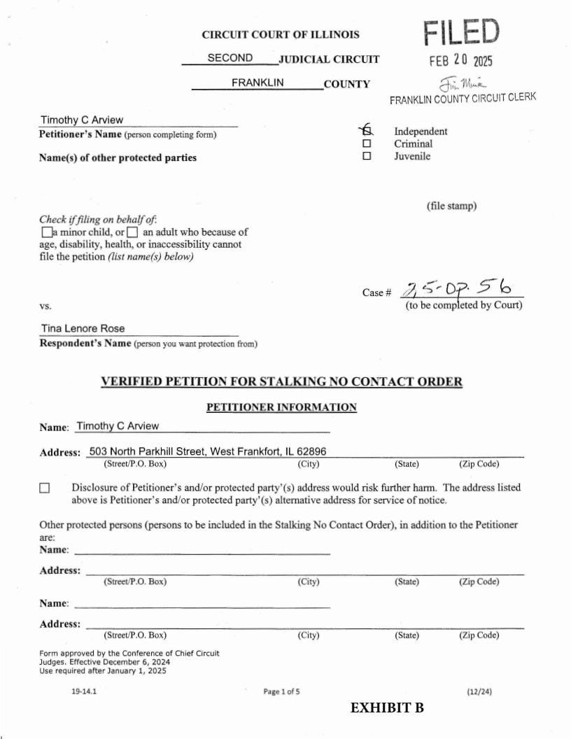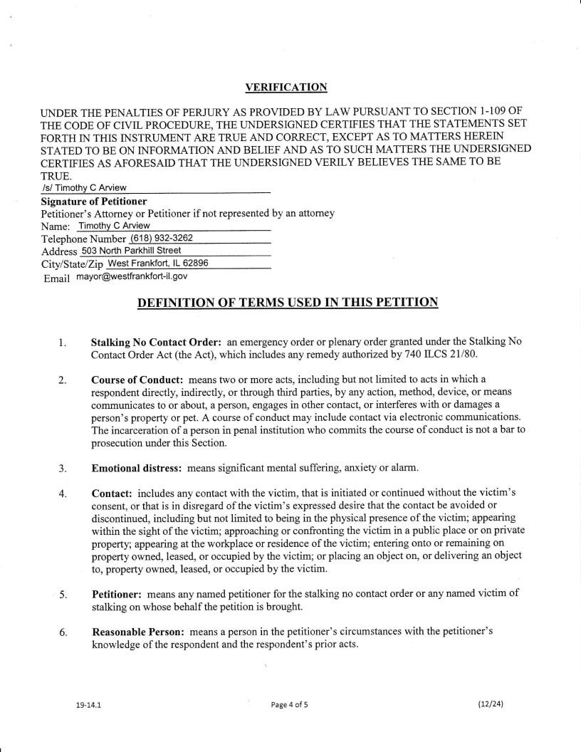 Here is a copy of the order of protection, technically a STALKING NO CONTACT ORDER - that was filed by TIMOTHY C. ARVIEW - on February 20 and it has his signed testimony right there for all to see. You can see what he stated as truth - and insinuated as truth and signed it under penalty of perjury.
