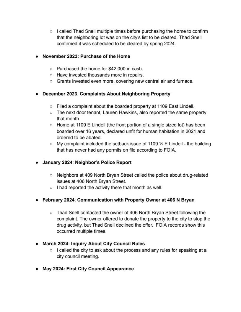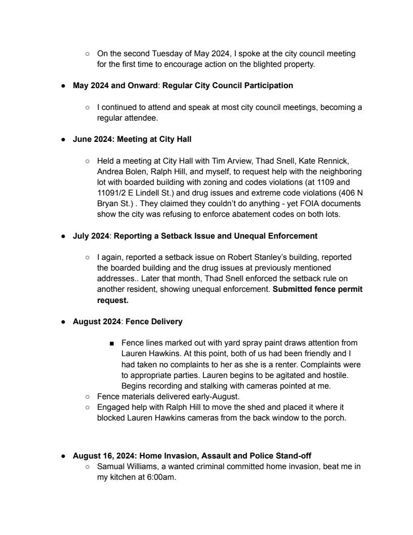 It begins with the first public-private agreement to cause harm—captured on video at the August 27, 2024 council meeting—where the same names first joined forces to discuss taking my property and silencing my complaints.