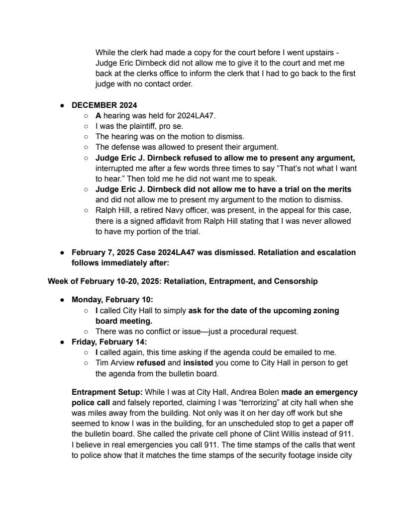 Between those dates lies a pattern: coordinated obstruction of zoning rights, misuse of city resources for personal lawsuits, false police reports, and the weaponization of public meetings as stages for humiliation. The videos show that this was never isolated misconduct; it was a system of retaliation carried out in full view of the public.