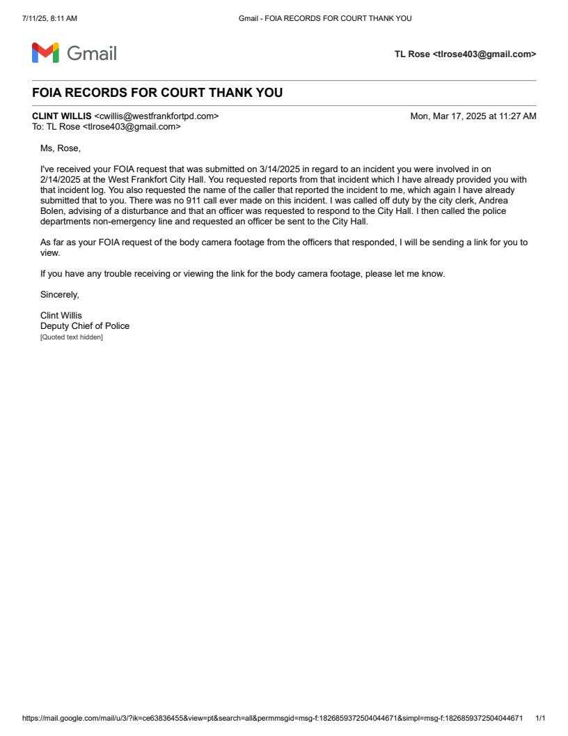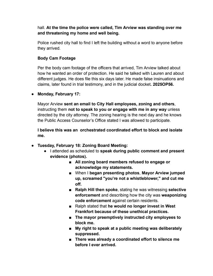 I believe it is about 8 min 50 sec in - I am the woman in the gray coat coming into city hall. The date and time is stamped. While Arview is standing over me - he is threatening to demolish my home and trying to frighten me into some type of reaction. The time stamps of him doing this - correlate with time stamps from the call to the police. Andrea Bolen had her day off - was far away from city hall, but she called the cell phone of Clint Willis, our current Chief of Police to tell him I was terrorizing Arview. You can see clearly, although no sound is recorded, physically Arview is the one terrorizing me - and outside of a hand up motion to stop, I do not react. I leave. But you also see Arview run to the door looking, like he is expecting the police and disapointed they have not arrived. If Arview was standing over me, and he didn’t call the police - how did he know they were coming? This is security footage from 2/14/2025 in city hall - the city’s own unedited footage.