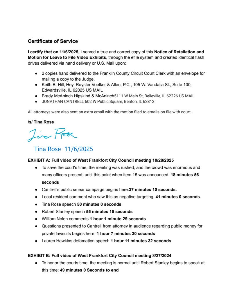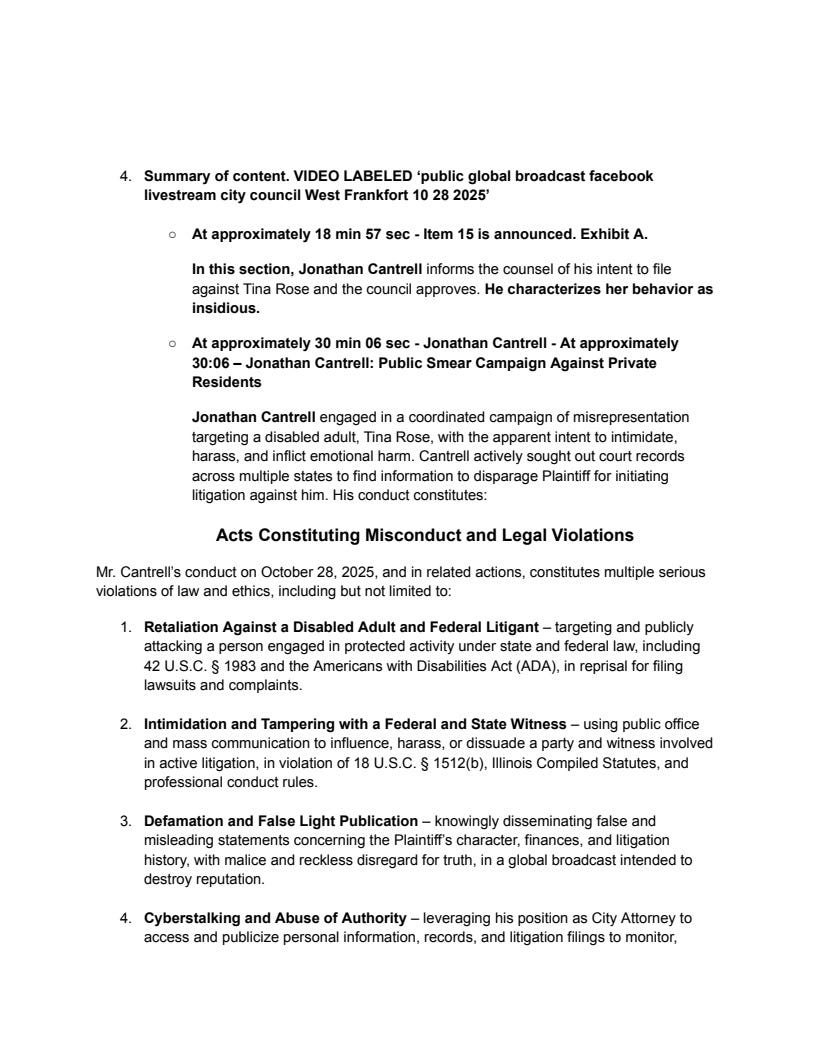 On October 28, 2025, West Frankfort’s City Attorney, Jonathan Cantrell, used a public council meeting—and the City’s official Facebook livestream—to wage what can only be described as a digital show trial against a private resident.