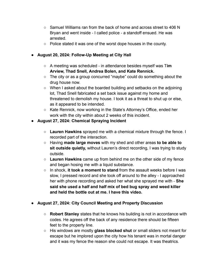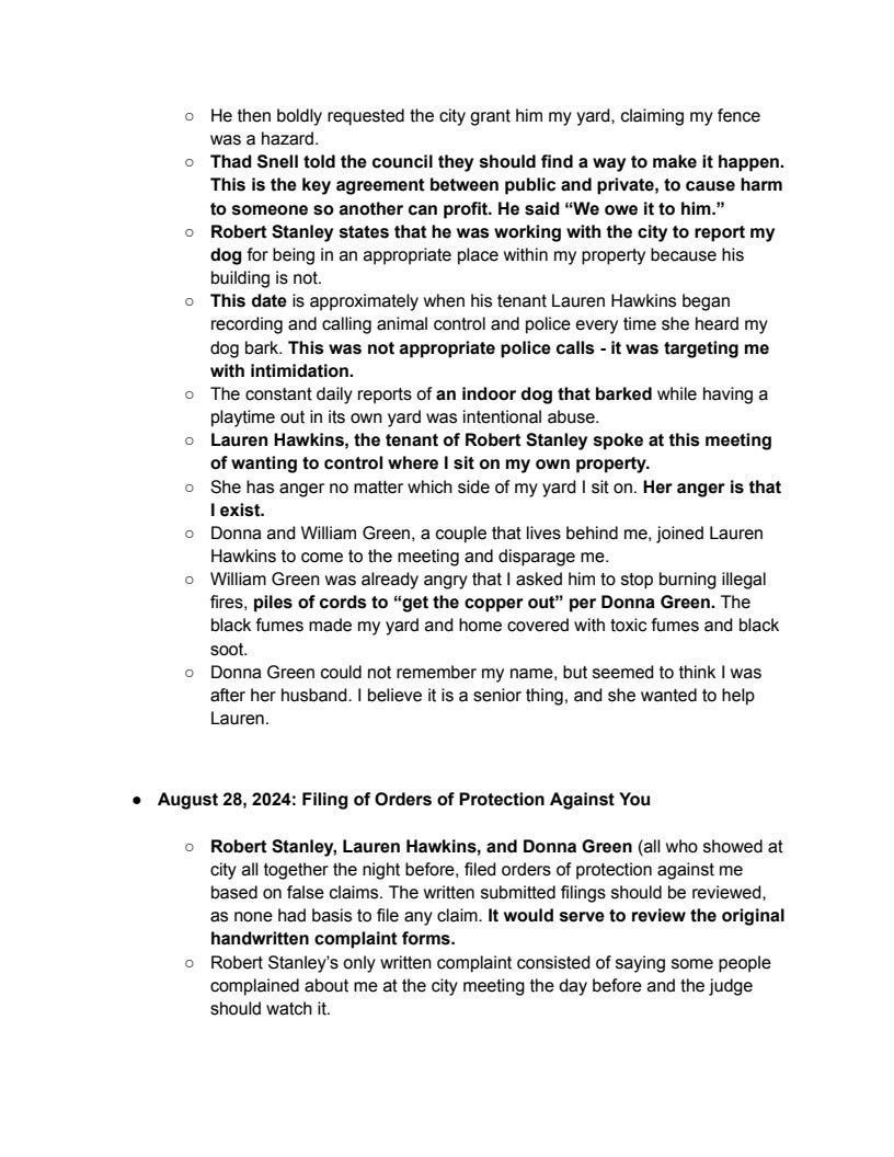 This video - *your interest starts at 49 minute mark - Robert Stanley asks council for my property and code officer ends saying the “City owes it to him” and this is a full, public - private agreement to cause harm to a disabled adult so another can profit - a RICO on video. THIS VIDEO IS THE INITIAL AGREEMENT AND THE GROUP, AS A WHOLE, BEGAN TARGETING ME WITH WHAT I BELIEVE IS A HATE CRIME. VIDEO IS 8/27/2024 - Exactly 7 days after Thad Snell threatened to demolish my home without cause for reporting Robert’s setback problem.